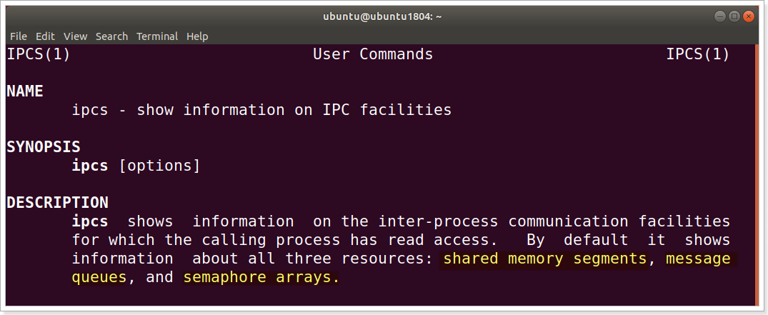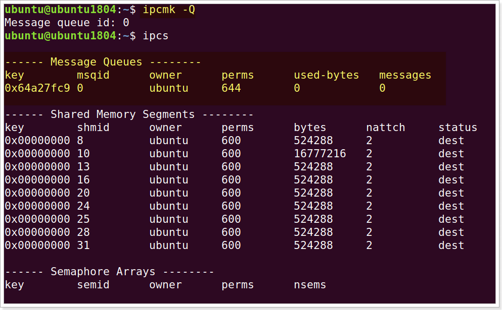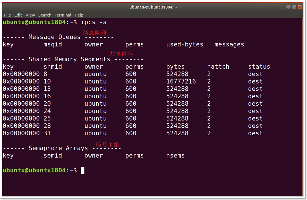 在Linux中,使用命令ipcs -a可以查看系统中所有的IPC对象(包含消息队列、共享内存、信号量组)的详细信息。