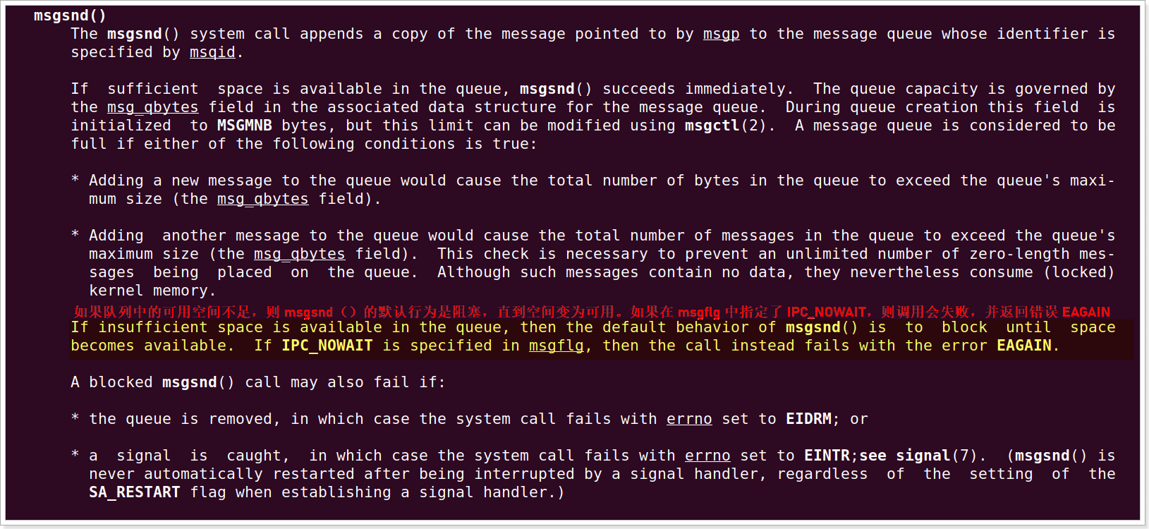 - IPC_NOWAIT:非阻塞模式。如果队列剩余空间不足,直接返回-1,并设置错误码(EAGAIN),不阻塞进程。