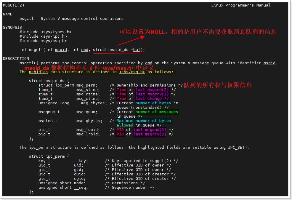 - struct msqid_ds *buf:指向msqid_ds结构体的指针,用于存储/设置队列属性;如果cmd=IPC_RMID,可设为NULL(无需属性)。