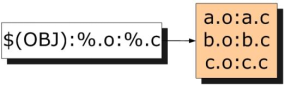工作原理是:$(OBJ)被称为原始列表,即(a.o b.o x.o y.o),紧跟在其后的%.o被称为匹配模式,含义是在原始列表中按照这种指定的模式挑选出能匹配得上的单词(在本例中要找出原始列表里所有以.o为后缀的文件)作为规则的目标。